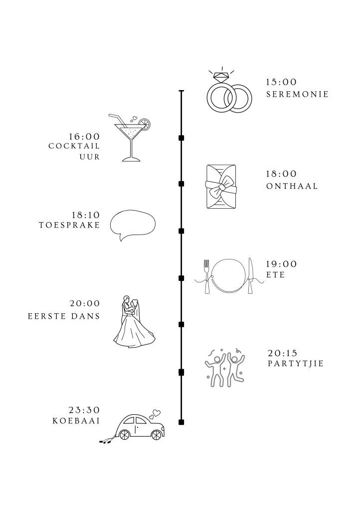 Gaste word vriendelik versoek om 30 minute voor die seremonie te arriveer sodat daar genoeg tyd is om sitplekke in te neem.